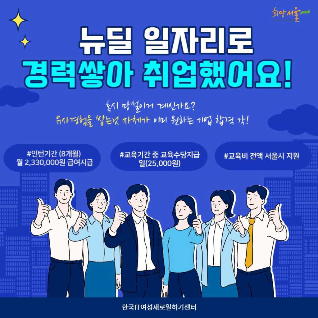 「그 기회」는 어떤 것입니까?앞서 말씀드린 기회는 서울시에서 청년층 취업률 상승을 위한 서울형 뉴딜일자리 사업으로 약 4500명 정도를 선발하여 실무인력을 양성하는 사업이라고 생각해 주시면 감사하겠습니다.1년에서 최대 1년 6개월간 인턴생활을 하며 월 최대 241만원을 받을 수 있으며 동시에 공휴일 및 유급휴가도 보장됩니다.그리고 정규직 전환, 즉 확실한 취업을 위해 총 160시간가량의 직무역량 교육을 지원하고 연 3회 자격증 취득 비용도 지원하고 있습니다.(1회 5만원) 이를 통해 남들보다 쉽게 취업에 성공할 수 있기 때문에 기회라고 설명할 수밖에 없습니다.