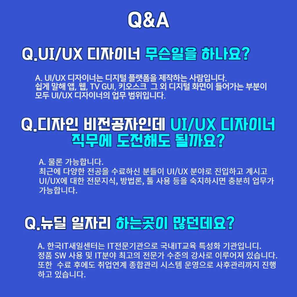 UI/UX 디자인 교육은 한국IT여성새일센터! 서울형 뉴딜일자리 사업은 매월 진행되는 것이 아니라 1년에 한 번씩 진행되는 서울시 사업입니다.그리고 내년에도 똑같이 진행된다는 보장은 없기 때문에 지금이 어떻게 보면 여러분들에게 마지막으로 더 쉽게 취업해서 무료로 교육받을 수 있는 기회일 수도 있습니다.따라서 이번 기회에 UI/UX 디자인 교육을 한국IT여성세일센터를 통해 듣고 보다 안정적으로 취업해 보시기 바랍니다.